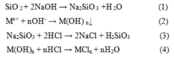 目前,堿酸法已形成了較為成熟的工藝,整個工藝流程主要分為堿熔和酸浸兩個步驟。其原理為:在石墨試樣中加入適量的NaOH,反應在一定的溫度條件下進行。NaOH屬于強堿,能與石墨中的酸性雜質SiO2、Al2O3、Fe2O3、CaO、MgO等發生反應,將SiO2轉化為水溶性硅酸鈉,然后可以用水洗滌除去。剩余的雜質形成的氫氧化物難溶于水,在一定溫度下經過酸浸處理生成可溶于水的鹽。主要反應如式(1)~式(4):
