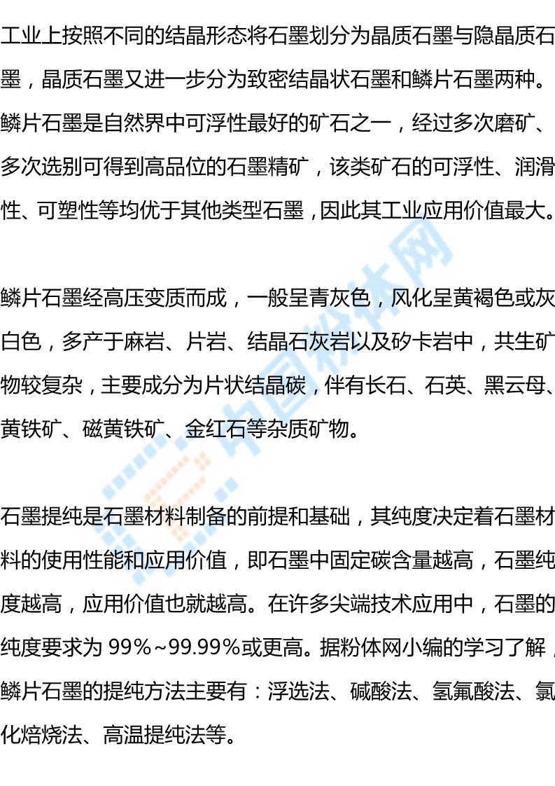 石墨作為優質的礦物原料,其應用已經囊括了人類賴以生存的能源、環境及信息領域,冶金、電子、航空航天和其他支撐國民經濟的行業與石墨材料密不可分。石墨要進行深加工對純度有一定的要求,并且伴隨著石墨的相關科學研究越來越深入,高純石墨的需求量會越來越大,石墨礦石的提純將會變得越來越重要。
