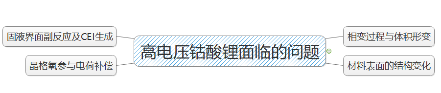 在鈷酸鋰電極材料的探索中,高電壓鈷酸鋰的探索一直是縈繞在研究人員心中。在早期的鈷酸鋰探索中,當電壓高于4.25V時,電池的循環性能出現了快速的衰減,此時鈷酸鋰材料六方晶相開始向單斜相轉變。相關研究表明單斜相變與電池性能衰減之間的關系如下:相變過程中材料體積變化導致材料性能變化;相變不可逆造成容量衰減與結構破壞;表面副反應進一步加劇;過渡金屬溶解加速Li源消耗;氧參與電荷轉移進一步氧化電解液。隨著對材料改性技術的運用,相關高電壓鈷酸鋰材料取得了長足的進步,然而關于高電壓鈷酸鋰材料的研究依然愛不得不面對如下幾個問題: