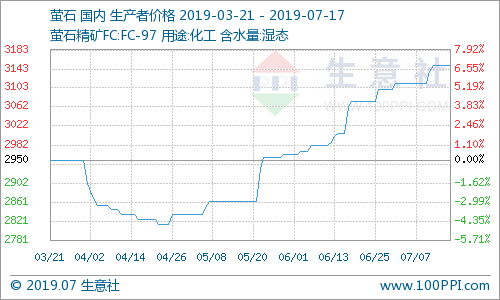 據統計,國內螢石價格走勢暫穩,截止17日國內螢石均價為3150元/噸,近期國內螢石裝置開車正常,場內礦山和浮選裝置正常開工,場內螢石供應略顯緊張,近期下游氫氟酸價格上漲,對于螢石市場按需采購,螢石市場價格走勢上漲。近期下游裝置開工情況一般,場內螢石現貨供應正常,終端下游接貨情況好轉,導致市場價格走勢上漲。截止17日內蒙古地區97螢石濕粉價格在2900-3100元/噸,福建地區97螢石濕粉商談主流在3000-3300元/噸,河南地區97螢石濕粉價格在2900-3200元/噸,江西地區97螢石濕粉價格在3000-3300元/噸,螢石價格走勢維持高位。