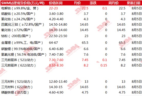中國粉體網訊 8月5日,鈷鋰新能源現貨報價:三元前驅體(622/動力)上漲0.15萬元/噸,均價8.2萬元/噸;三元前驅體(523/動力)上漲0.1萬元/噸,均價7.45萬元/噸。