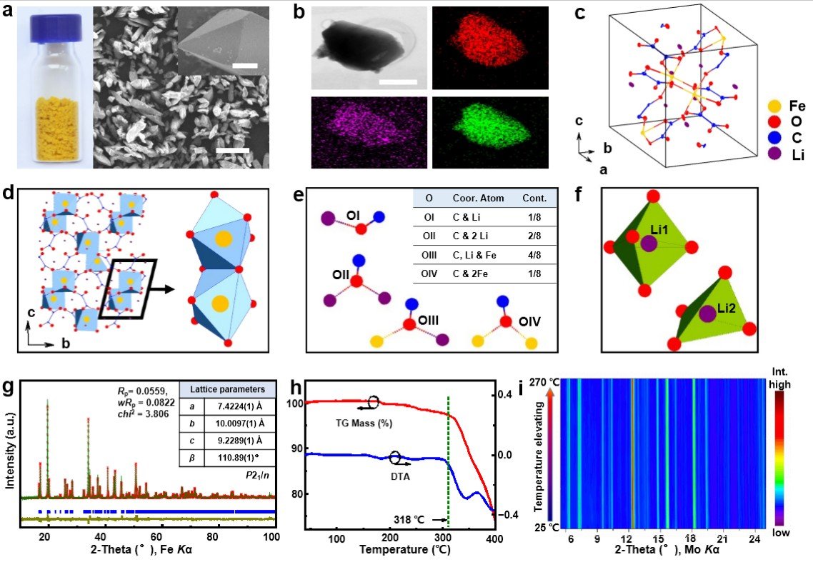 圖:新型正極材料表征(a,b)、晶體結(jié)構(gòu)解析(c-f)以及純度(g)與熱穩(wěn)定性能表征(h,i)