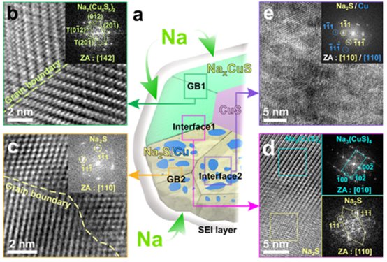 研究團隊發(fā)現(xiàn),在轉化反應中,對于實現(xiàn)耐粉碎轉化反應和容量恢復,半共格相界面(semi-coherent phase interface)和晶界起到關鍵作用。硫化銅通過漸進性的晶體變化,生成半共格相界面,最終阻止顆粒的粉碎。基于這一獨特的機理,研究人員證實,無論大小和形態(tài)如何,硫化銅都具有高容量和高循環(huán)穩(wěn)定性。Yuk教授表示:“使用硫化銅,可以促進鈉離子電池的發(fā)展,有助于開發(fā)低成本儲能系統(tǒng),并解決微塵問題!