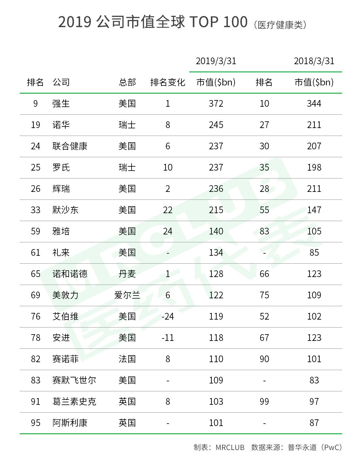 而市值最高的醫藥企業強生是 3720 億美元,位居百強企業第 9 位。