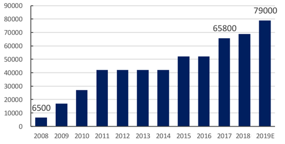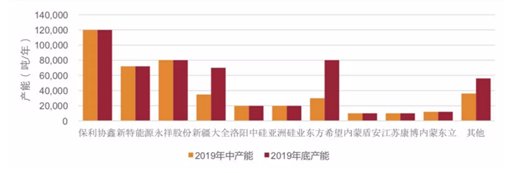 2018年底,全球多晶硅的名義產(chǎn)能為59.8萬(wàn)噸,其中,國(guó)內(nèi)多晶硅企業(yè)的名義產(chǎn)能為38.8萬(wàn)噸/年,海外產(chǎn)能為21萬(wàn)噸;2019年上半年,全球多晶硅的名義產(chǎn)能為64.2萬(wàn)噸,其中國(guó)內(nèi)的多晶硅的名義產(chǎn)能為43.3萬(wàn)噸,海外產(chǎn)能為20.9萬(wàn)噸,全球多晶硅產(chǎn)業(yè)向中國(guó)轉(zhuǎn)移的趨勢(shì)越發(fā)明顯。