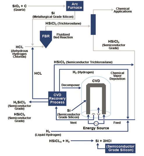 Hemlock Semiconductor(HSC)是一家致力于為電子和太陽(yáng)能行業(yè)提供高純度多晶硅的可靠供應(yīng)商。Hemlock的工藝從天然高純度石英巖開(kāi)始,它被加工成硅基化學(xué)品三氯氫硅。使用化學(xué)氣相沉積反應(yīng)器技術(shù)工藝,將三氯氫硅轉(zhuǎn)化為純度高達(dá)99.999999999%的高純度多晶硅。