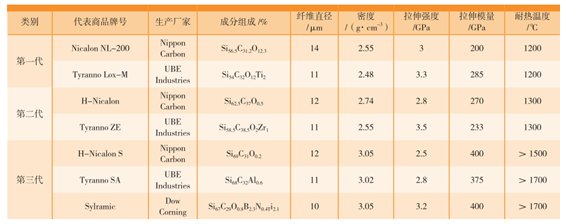 經過數十年的研究,國際上已研發出具有代表意義的三代SiC纖維。根據纖維中氧、碳的含量的不同,可將這三代SiC纖維歸類為高氧高碳、低氧高碳和近化學計量比纖維。