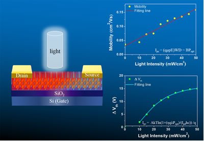 他們利用空間限域、反溫度結晶相結合的方法生長出的CsPbBr3薄單晶沒有明顯的晶粒界疇,厚度在2微米左右,尺寸可以達到毫米級或更大尺寸,便于電子、光電子器件的制備和應用。基于此薄單晶的場效應晶體管在室溫下具有雙極性,且其載流子傳輸表現出奇異的光強依賴性:電子的遷移率與光照強度無關,而空穴的遷移率隨光照強度的增加而增加;在電子為多數載流子時,閾值電壓表現出了光的依賴性,而空穴為多數載流子時卻沒有這一現象。這是首次在鈣鈦礦材料中報道這一現象。作者分析認為:這種特殊的傳輸特性是分別由光電導效應和光伏效應引起的,體現了鈣鈦礦材料載流子傳輸機制的特殊性。在50 mW/cm2的光照條件下,所制備的場效應晶體管在室溫下具有0.40(0.34)cm2 V-1 s-1的電子(空穴)遷移率,顯著優于迄今為止所報道過的基于CsPbBr3鈣鈦礦材料的場效應晶體管。另外,所制器件也表現了優良的光探測器性能。