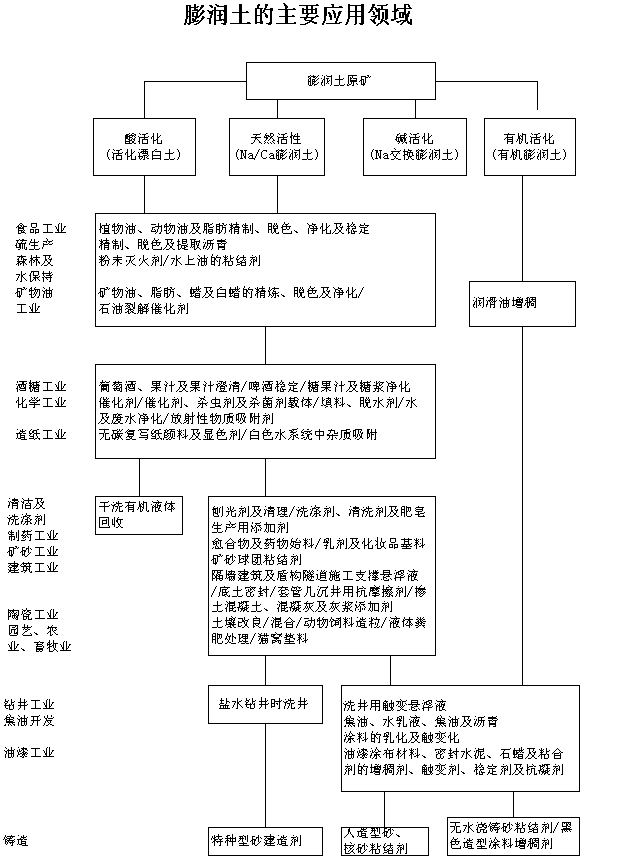 活化膨潤土基本上是作為精制(煉)劑用于生產食用油和脂肪、工業用油、脂肪及蠟、衛生用品、美容皂,以及作為一種組份由于許多產品(如油漆)。