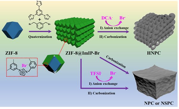 在國家自然科學基金和中國科學院戰略性先導科技專項(XDB20030200)的資助下,中科院福建物質結構研究所結構化學國家重點實驗室王瑞虎課題組利用離子聚合物包覆的ZIF-8核殼結構(ZIF-)作為前驅體,采用陰離子交換策略引入雙氰銨根離子(DCA),經高溫碳化誘導核殼結構分解并相互交聯,成功制備出一類相互連接的中空氮摻雜多孔碳材料(HNPC)。這種結構能夠減小材料的界面電阻,增強對多硫化物的吸附能力,提高活性物質的利用率,使得電池在8@ImIP2 C的倍率下穩定循環800圈以后,仍能達到562 mAhg-1的比容量,電化學性能明顯優于傳統雜原子摻雜的碳材料。上述研究工作發表在《先進功能材料》(Adv. Funct. Mater. 2019, 29, 1902322. DOI: 10.1002/adfm.201902322),文章的第一作者是李忠林。