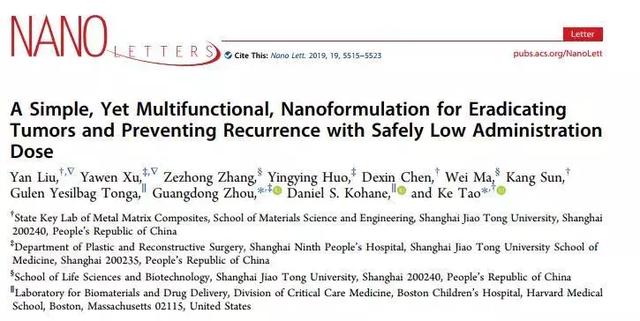 中國粉體網(wǎng)訊 近日,上海交通大學材料科學與工程學院、金屬基復合材料國家重點實驗室陶可副研究員、孫康教授研究團隊及其合作者在納米材料領域取得了新進展,研究成果以“A simple yet multifunctional nanoformulation for eradicating tumors and preventing recurrence with safely low administration dose”為題,發(fā)表在國際權威學術期刊Nano Letter (Nano Lett. 2019, 19, 5515-5523. IF=12.279)上。