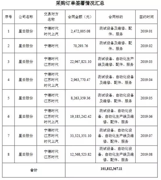 截止目前,星云股份與寧德時代及其控股子公司簽訂采購訂單金額已累計超過10.18億元,占公司2018年度經審計主營業務收入的33.69%。