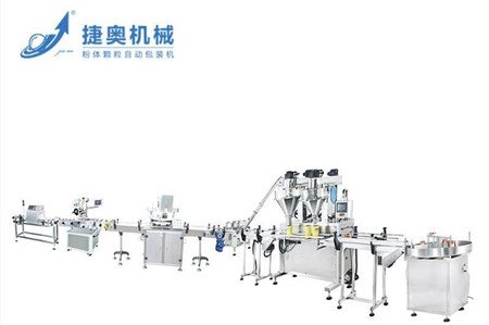 全自動粉末灌裝生產(chǎn)線:理瓶機→自動上料機→雙頭粉末灌裝機→自動旋蓋機(或封罐機)→瓶口鋁箔封口機→貼標(biāo)機→金屬檢測→噴碼機→鏈板輸送帶→裝箱平臺,可以根據(jù)客戶的要求選擇流水線配置。