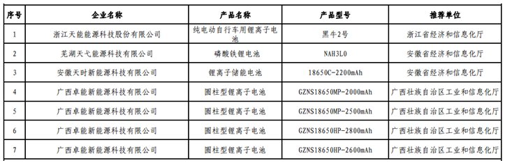 信息來源:工信部,浙江天能能源、蕪湖天弋能源、安徽天時新能源、廣西卓能新能源公司官網。