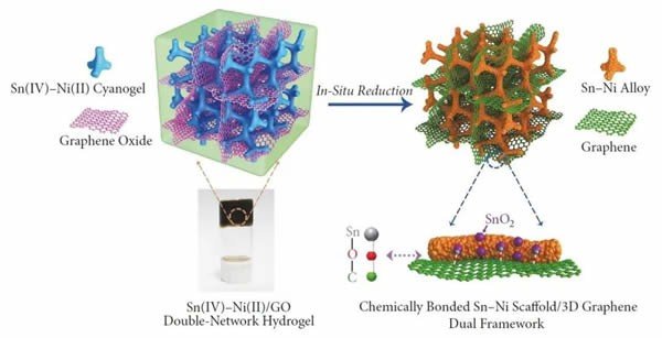 德克薩斯大學(xué)奧斯汀分校余桂華團(tuán)隊(duì)提出一種雙網(wǎng)絡(luò)凝膠還原策略,制備出物理交聯(lián)且化學(xué)鍵合的一體化石墨烯基雙框架材料用于高性能鋰離子電池負(fù)極。以錫基合金負(fù)極材料為例,首先構(gòu)建出由氧化石墨烯凝膠和氰基橋聯(lián)(Sn–N≡C–Ni)配位聚合物凝膠(錫鎳氰膠)組成的一體化雙網(wǎng)絡(luò)凝膠,進(jìn)一步還原該凝膠可制得由Sn–Ni合金框架和三維石墨烯相互交織的Sn–Ni/G雙框架材料(圖1)。