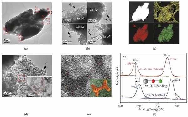 其中,Sn–Ni合金框架與三維石墨烯高度均勻分布,且無(wú)定形合金表面氧化物組分有利于兩者之間形成強(qiáng)烈的Sn–O–C鍵,進(jìn)一步增強(qiáng)儲(chǔ)能應(yīng)用中的協(xié)同作用(圖2)。