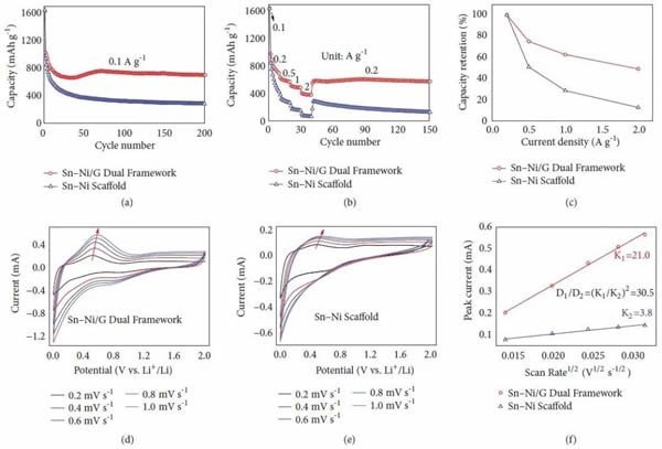 作為鋰離子電池負(fù)極,雙框架結(jié)構(gòu)具有優(yōu)異的穩(wěn)定性和混合離子傳輸通道,同時(shí),界面Sn–O–C鍵進(jìn)一步穩(wěn)定結(jié)構(gòu)并加速電荷傳輸,因此,該Sn–Ni/G雙框架材料表現(xiàn)出了良好的循環(huán)穩(wěn)定性和倍率特性(圖3)。在0.1 A/g的充放電速率下經(jīng)過200次循環(huán),其可逆比容量高達(dá)701 mAh/g;在1 A/g的大速率下,其平均比容量仍高達(dá)497 mAh/g。