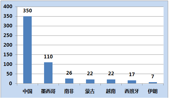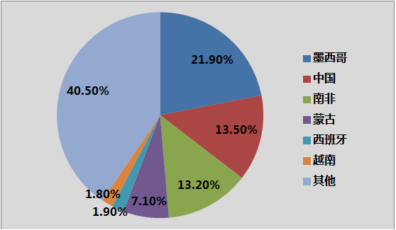 2018年全球主要國家螢石產量分布情況(萬噸)