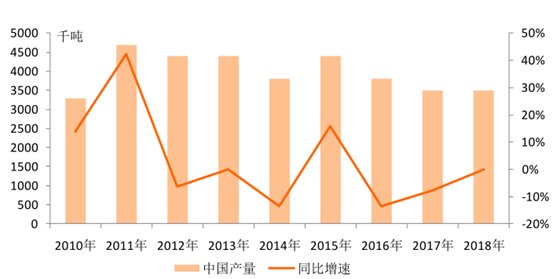 根據美國地質調查局(USGS)數據,我國螢石產量 2011 年達到 470 萬噸的極值,隨后螢石產量整體呈下降趨勢,2018 年我國螢石產量為 350 萬噸,相比 2011 年降幅為 25.5%。