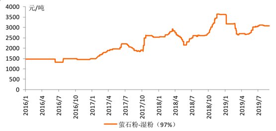 行業景氣度向好,螢石價格 維持上行趨勢。2019二季度以來,受內蒙古地區礦山整改以及環保壓力的影響,螢石礦山及選廠開工情況不佳,螢石塊市場供應相對偏緊,而下游需求相對穩定,螢石粉價格企穩回升。