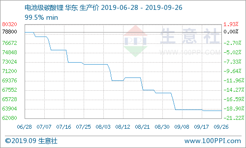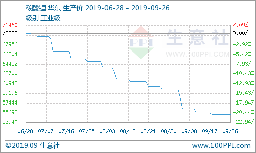中國粉體網訊 根據生意社價格監(jiān)測,9月碳酸鋰華東市場價格仍舊呈現下行趨勢,但后期市場整體下降幅度逐漸減小。9月26日工業(yè)級碳酸鋰華東地區(qū)均價價格為55400元/噸,月末與月初相比下降-7.67%。9月26日電池級碳酸鋰華東地區(qū)均價價格為63600元/噸,月末與月初相比下降-5.07%。