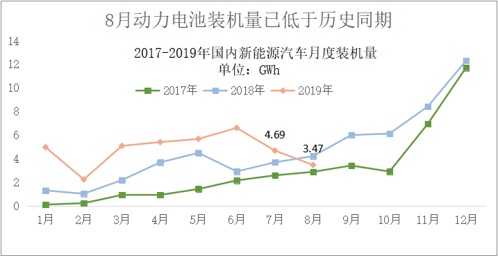 8月份車用動力電池裝機量約為3.47GWh,同比下滑17.81%,環比下滑26.08%;1-8月,動力電池累計裝機38.18GWh,同比累計增長62.19%。