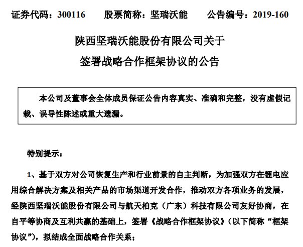 堅瑞沃能發布公告表示,為加強雙方在鋰電應用綜合解決方案及相關產品的市場渠道開發合作,推動雙方各項業務的發展, 堅瑞沃能股份有限公司與航天柏克(廣東)科技有限公司簽署《戰略合作框架協議》擬結成全面戰略合作關系。