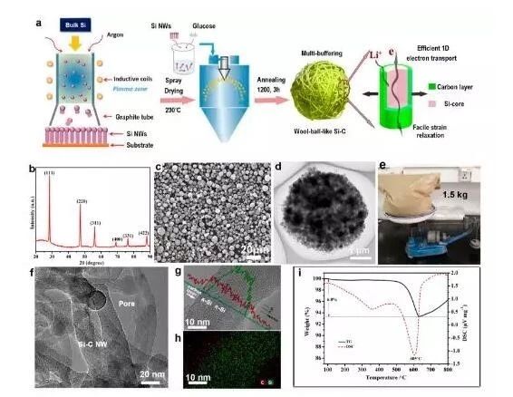 近日,中國科學院過程工程研究所在熱等離子體制備硅納米線負極材料上取得新進展,實現每小時公斤級量產,且制備的電池容量和壽命都達到較高標準,與碳材料復合后循環1000次的容量仍有2000mAh/g,為硅碳負極材料的產業化進展提供了新思路。相關研究結果發表在ACS Nano上。