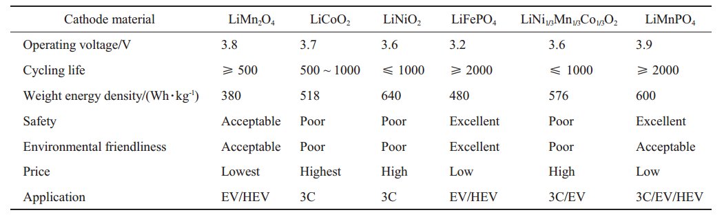 在目前所報道的一系列正極材料中,LiMnPO4正極材料具有4.1V的高電位,比LiFePO4提高0.7V,且處于現有電解液的穩定電化學窗口。據相似的放電比容量和壓實密度測算,LiMnPO4電池的能量密度較LiFePO4提高約20%,達190Wh·kg-1,且LiMnPO4價格更便宜。與錳酸鋰相比,LiMnPO4具有相近的工作電壓,但能量密度更高、高溫循環壽命更長。與三元材料相比,LiMnPO4具有相似的能量密度,但更安全、價格更低。