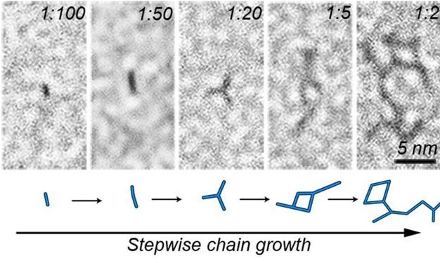 三乙胺的加入,讓“平鋪直敘”的結晶過程變成了一場“賽跑”:溶液中的碳酸根離子既能與鈣結合,又能與三乙胺結合,那么誰的速度更快?最終結果是,幾個碳酸根離子剛和幾個鈣離子形成一個“短鏈”,三乙胺就上來“封”在碳酸根離子的一端,讓它無法再與下一個鈣離子結合——于是,溶液中充滿了被三乙胺“封”住的碳酸鈣“短鏈”,科學家將其稱為“寡聚體”。