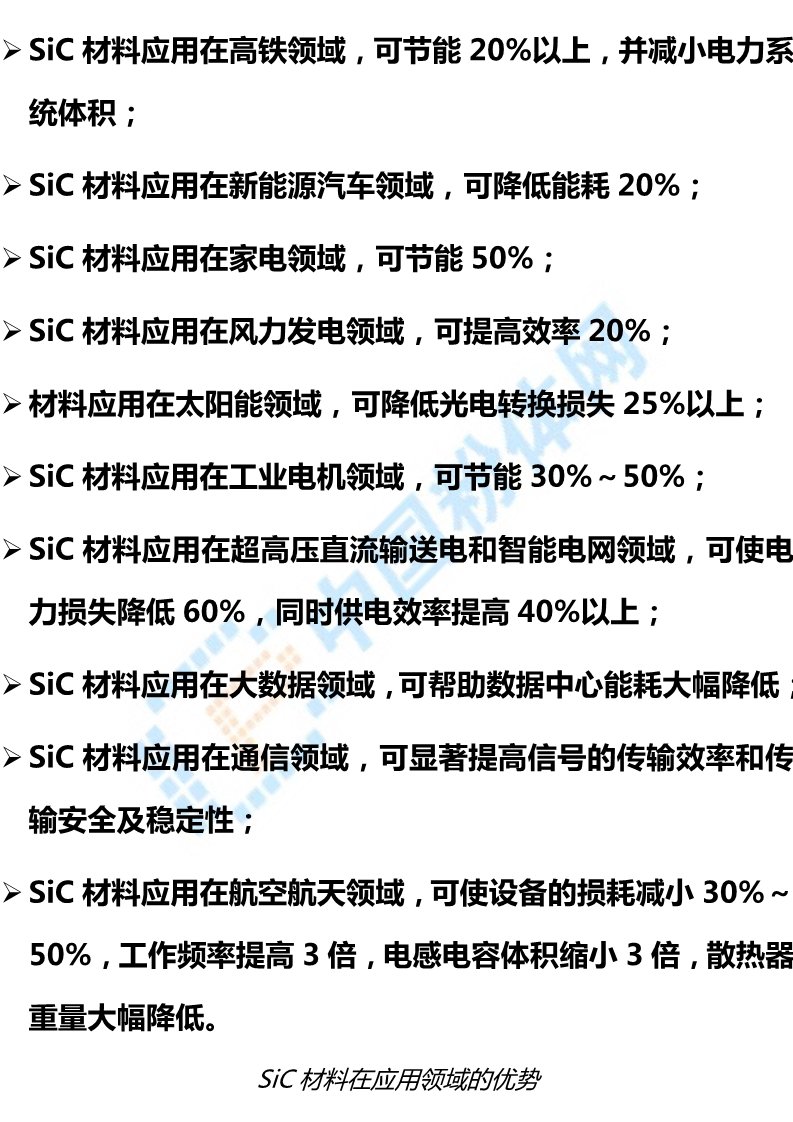 鑒于碳化硅材料各方面的優良特性,其有望成為最重要的第三代半導體材料,未來或會全面取代目前廣泛應用的硅半導體材料,其應用領域更廣,潛在市場更大,關系到國家經濟的長遠發展和戰略安全。隨著我國新能源汽車的推廣和電網的升級改造,碳化硅材料將在電動汽車充電樁、提高電動汽車能源效率、智能電網建設、計算機領域等諸多方面得到大規模應用。