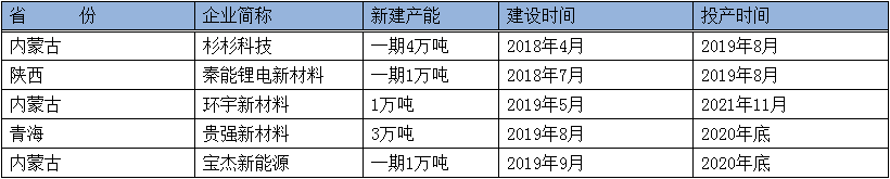 2019年國內三季度投產的負極材料項目共有兩個,分別是內蒙古杉杉包頭一體化生產項目的一期4萬噸/年和秦能鋰電的負極材料生產項目一期1萬噸/年,而其他已規劃的項目陸續開工建設,分別是環宇新材料1萬噸/年、貴強新材料3萬噸/年、寶杰新能源的一期1萬噸/年的負極材料項目。詳情如下表。