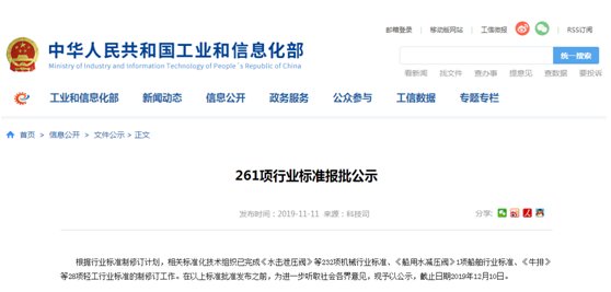 中國粉體網(wǎng)訊 據(jù)工信部11日消息,根據(jù)行業(yè)標(biāo)準(zhǔn)制修訂計(jì)劃,相關(guān)標(biāo)準(zhǔn)化技術(shù)組織已完成《水擊泄壓閥》等232項(xiàng)機(jī)械行業(yè)標(biāo)準(zhǔn)、《船用水減壓閥》1項(xiàng)船舶行業(yè)標(biāo)準(zhǔn)、《牛排》等28項(xiàng)輕工行業(yè)標(biāo)準(zhǔn)的制修訂工作。在以上標(biāo)準(zhǔn)批準(zhǔn)發(fā)布之前,工信部為進(jìn)一步聽取社會各界意見,將上述行業(yè)標(biāo)準(zhǔn)予以公示,公示截止日期為2019年12月10日。