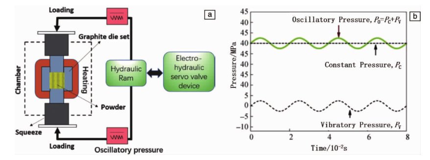 謝志鵬教授課題組提出在粉末燒結過程中引入動態振蕩壓力替代現有的恒定靜態壓力這一全新的設計思想,并在國際上率先研發出一種OPS技術和設備,其基本原理是在一個比較大的恒定壓力作用下,疊加一個頻率和振幅均可調的振蕩壓力,將傳統燒結中施加的“死力”變為“活力”,振蕩壓力耦合裝置和原理示意圖如圖5所示。