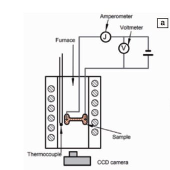 FS技術于2010年由科羅拉多大學的Cologna等首次報道,其來源于對電場輔助燒結技術(field-assisted sin-tering technology,FAST)的研究。圖2是一種典型的FS裝置示意圖,待燒結陶瓷素坯被制成“骨頭狀”,兩端通過鉑絲懸掛在經過改造的爐體內,向材料施加一定的直流或交流電場。爐體內有熱電偶用于測溫,底部有CCD相機可實時記錄樣品尺寸。