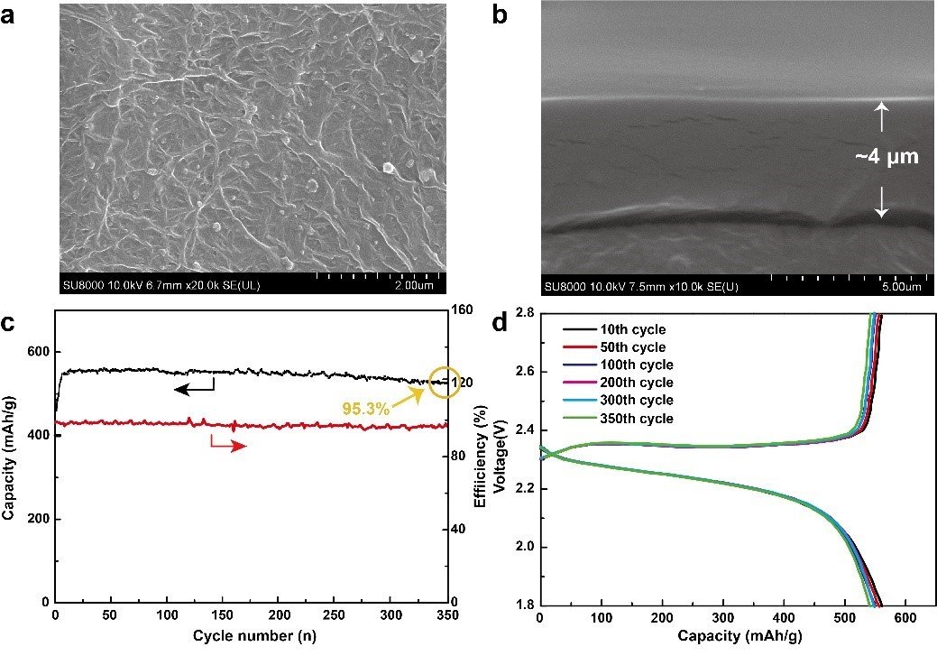 Fig. 1. (a) The surface and (b) cross-sectional morphologies of solid polymer electrolyte membrane. (c) The cycle performances and (d) charge/discharge curves of Li-S batteries with solid polymer electrolyte membrane.