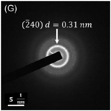 圖F為一個典型的砂磨后的Ta-LLZO顆粒的STEM照片。經過砂磨的細顆粒表面較為粗糙,對其中白色虛線框標記的區域做選區電子衍射(SAED),結果如圖G所示。電子衍射花樣為展寬明顯的多晶德拜環,最亮的環對應于晶面間距為0.31nm的(240)面。該面間距比純Ta-LLZO粉體和H+交換后的Ta-LLZO晶格中的數值大。說明砂磨后的細Ta-LLZO顆粒表面和內部晶格變形并多晶化。圖H為顆粒表面的HRTEM原子排列圖像。該圖像表明,Ta-LLZO在極小的疇區內(1~2nm)有序排列,但不同疇區的排列完全是無序的,進一步證實了砂磨顆粒的多晶化,利于后續燒結。