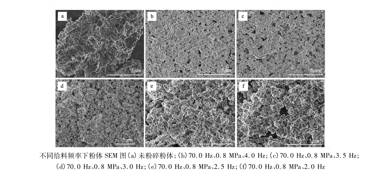 下圖為分級輪頻率70.0Hz;氣體壓力0.8MPa時,給料頻率變化對氧化鋁樣品粒徑及形貌的影響。