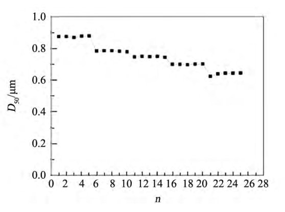 從變化曲線可以看出,隨著試驗序號的增加,粉體粒徑D50呈階梯狀降低,中間有起伏波動,粉體粒度分布范圍由原來的0~60μm降至0~6μm說明影響因素對粉體粒度產生了一定的影響。