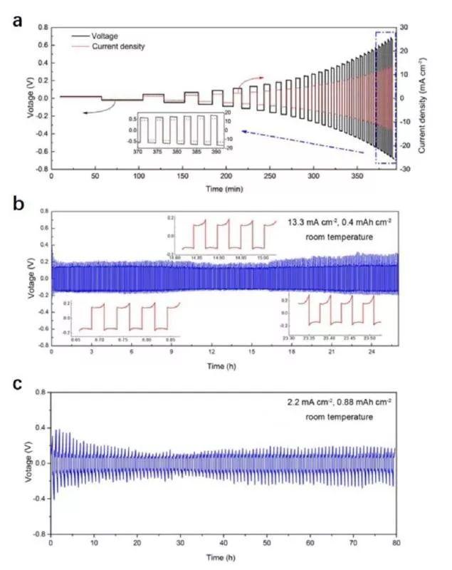 圖二(a)Li/LLZO/Li對稱電池在室溫條件下的極限電流密度測試圖;(b-c) 對稱電池在不同條件下的循環(huán)性能圖。