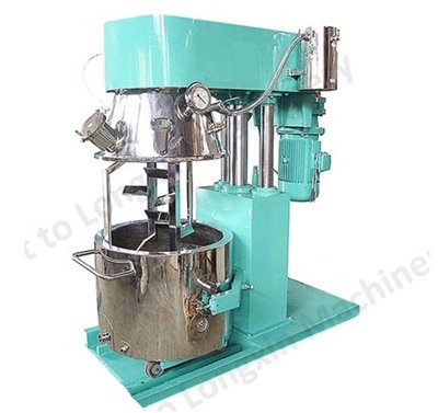 行星攪拌機(鋰電池專用)是一種新型高效無死點混合攪拌設備,它具有獨特、新穎的攪拌形式,釜內有兩根或三根攪拌器和一至兩個自動刮刀,攪拌器在繞釜體軸線公轉的同時,又以不同的轉速繞自身軸線自轉,使物料在釜體內作復雜的運動,受到強烈的剪切和搓合。此外設備內的刮刀繞釜體軸線轉動,將粘在壁上之物料刮下參于混合,使其效果更為理想。釜體采用特殊密封結構,可進行加壓及抽真空攪拌,具有良好的排氣除泡效果。釜體夾套可根據用戶需要進行加熱、冷卻。設備密封性良好。設備釜蓋可液壓升降,釜體可自由移動,操作十分方便。而且攪拌槳及刮刀可隨橫梁上升而完全脫離釜體,便于清洗。該機器適用于化工、輕工、食品、電池、制藥、建材、農藥等行業所需的多組份固-固相、固-液相、液-液相物料的混合、反應、分散、溶解、調質等工藝,如油墨、顏料、粘膠劑、密封膠、封裝膠軟膏、糊狀物料、潤滑脂、油漆、膏狀化妝品、添加物等多種高粘稠物的制備。攪拌器的形式,根據物料要求可為多層槳葉式、框式、蝴蝶式、葉輪式等。