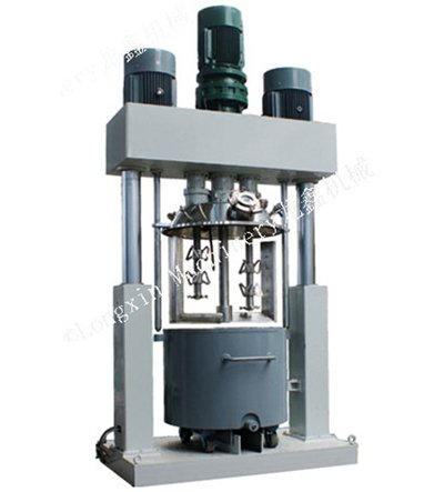 強力分散機(基料型)主要是用于各大硅酮膠生產企業的混合與分散攪拌等工藝過程。他是一種已被實踐證實了的高效多功能混合機,它能滿足用戶在操作中迅速改變操作工藝的要求,可以根據客戶要求定制各種能滿足高、低粘度物料的混合機器。工作容積從5L到5000L,動力按物料粘度設計,可廣泛應用于硅酮密封膠、粘合劑、化妝品、化工產品、電池、食品、藥品和塑料工業等行業。強力分散機釜內有3~4根不同形式的攪拌器,其中一個攪拌器(低速槳)在繞釜體軸線轉動,其余2~3個攪拌裝置(高速分散槳、高速乳化機)又以不同的轉速繞自身軸線高速自轉,使物料在釜內作復雜的運行,受到強烈的剪切和搓合。設備內山形刮壁刀繞釜體軸線轉動,將粘在壁上和底部的原料刮出參與混合,使混合效果更為理想。設備密封性好,可抽真空,具有良好的排氣除泡效果。設備釜蓋可液壓升降,釜體可自由移動,操作十分方便。