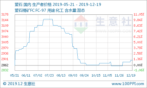 中國粉體網(wǎng)訊 12月19日螢石商品指數(shù)為101.56,與昨日持平,較周期內(nèi)最高點127.49點(2019-01-03)下降了20.34%,較2016年12月18日最低點49.21點上漲了106.38%。(注:周期指2011-09-01至今)