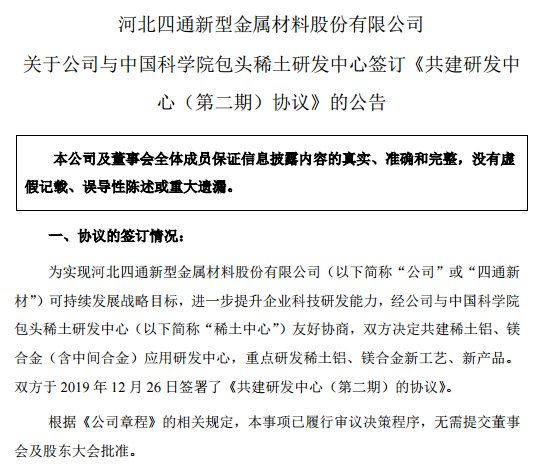 中國(guó)粉體網(wǎng)訊 四通新材12月31日早間公告稱,為實(shí)現(xiàn)公司可持續(xù)發(fā)展戰(zhàn)略目標(biāo),進(jìn)一步提升企業(yè)科技研發(fā)能力,經(jīng)公司與中國(guó)科學(xué)院包頭稀土研發(fā)中心友好協(xié)商,雙方?jīng)Q定共建稀土鋁、鎂合金(含中間合金)應(yīng)用研發(fā)中心,重點(diǎn)研發(fā)稀土鋁、鎂合金新工藝、新產(chǎn)品。雙方已于12月26日簽署了《共建研發(fā)中心(第二期)的協(xié)議》。