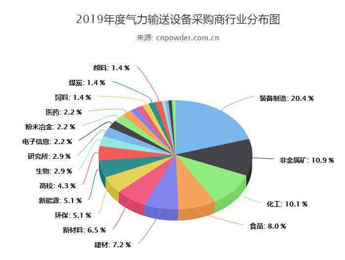而源于氣力輸送密閉無污染、占地面積小、靈活自由、自動化程度高等優(yōu)點,氣力輸送也被用于多種其他行業(yè)。如非金屬礦、化工、食品,建材等行業(yè),在2019年氣力輸送設備行業(yè),分別占據(jù)市場份額10%、10%、8%、7%。隨著環(huán)保力度的加大、氣力輸送技術的進一步發(fā)展,預估在這些行業(yè)氣力輸送設備將占據(jù)更大的市場份額。