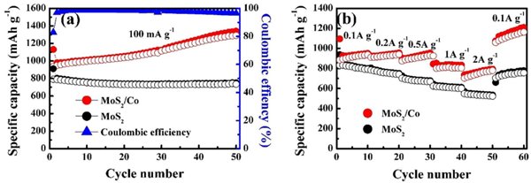 圖1. MoS2/Co復合材料的循環和倍率性能。