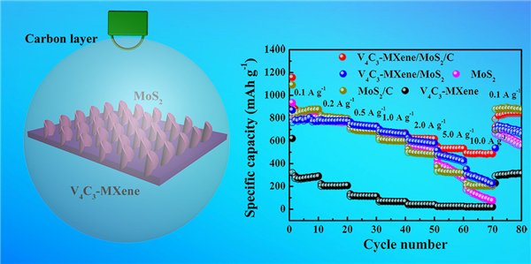 圖2. V4C3-MXene/MoS2/C復合材料的結構示意圖和倍率性能。