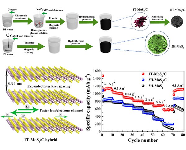 圖3. 1T-MoS2/C復合材料的合成過程、反應機制示意圖及倍率性能。