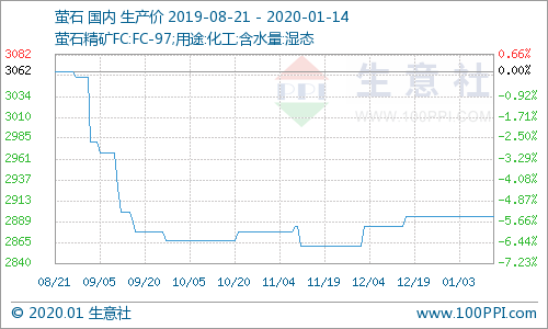 中國粉體網(wǎng)訊 1月14日螢石商品指數(shù)為101.56,與昨日持平,較周期內(nèi)最高點127.49點(2019-01-03)下降了20.34%,較2016年12月18日最低點49.21點上漲了106.38%。(注:周期指2011-09-01至今)