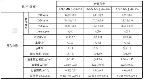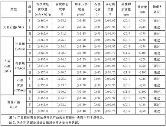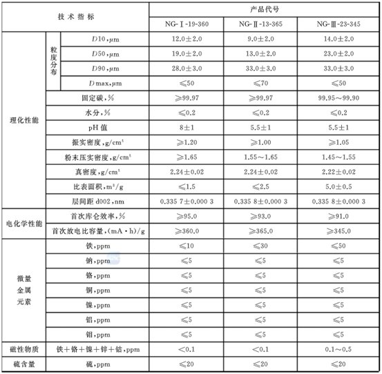 對于技術要求,外觀上為顏色灰黑或鋼灰,有金屬光澤的粉末。對于理化指標,鋰離子電池石墨類負極材料的理化指標應符合表1的規定,若有特殊要求由供需雙方協商確定。